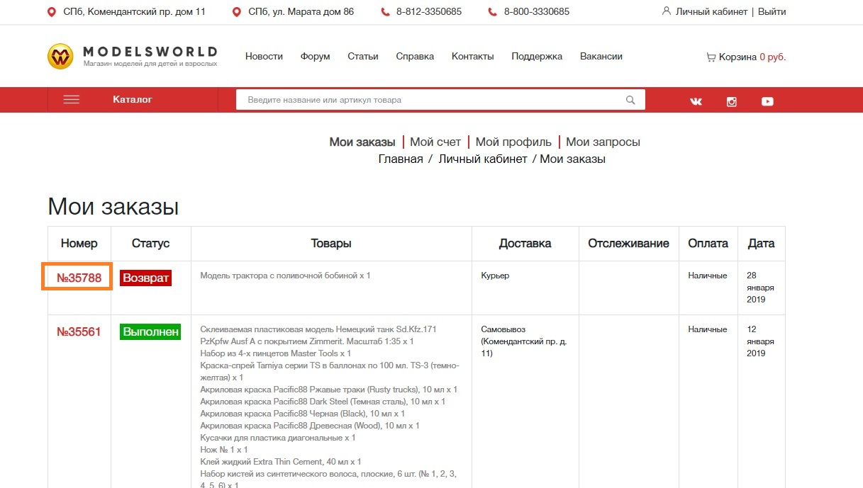 Сразу после входа в личный кабинет вы попадаете в подраздел "Мои заказы". В этом подразделе вы можете видеть краткую информацию о всех ваших заказах. Информация представлена в виде таблицы. В таблице отражены номер заказа, статус заказа, содержимое заказа, способ доставки, номер отправления, способ оплаты, дату заказа. При нажатии на номер заказа, открывается развернутая информация по заказу.