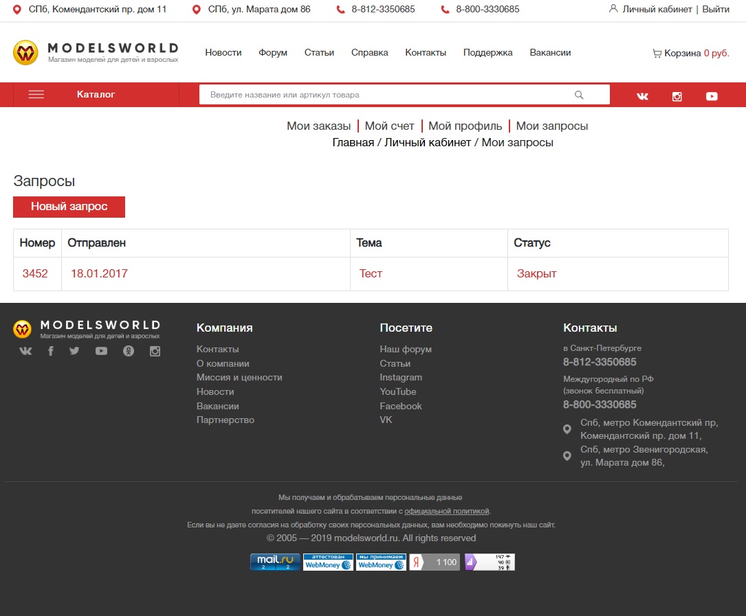 После регистрации в нашем магазине каждый пользователь может обратиться к нашим специалистам с вопросом. Воспользовавшись формой подачи запроса в этом разделе, нажав на кнопку Новый запрос.